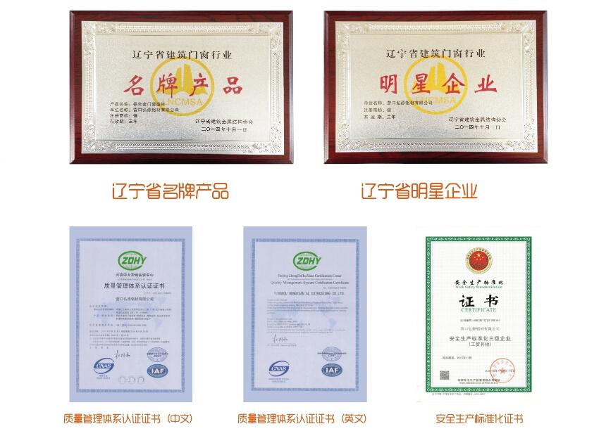 2014年,遼寧省建筑金屬結構協(xié)會頒發(fā)遼寧省建筑門窗行業(yè)“名牌產品證書”、“明星企業(yè)證書”、鋁合金型材、鋁合金幕墻“定點生產企業(yè)證書”;